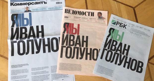 На первых полосах сегодняшних выпусков РБК, «Коммерсантъ» и «Ведомости» опубликовано совместное заявление в поддержку арестованного журналиста Meduza. Номера озаглавлены фразой «Я/Мы Иван Голунов», ставшей аналогом французского лозунга Je suis Charlie (Я – «Шарли») — мирового символа осуждения расстрела редакции сатирического издания Charlie Hebdo.