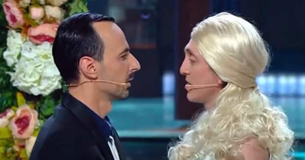 Дорохов и Александр Панекин изобразили поцелуй жениха и невесты.