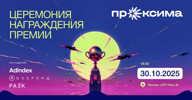 В этом году церемония соберет до 500 участников — среди них ведущие эксперты национального уровня в области маркетинга, более 100 членов гранд-жюри из числа компаний-рекламодателей, а также представители компаний, вошедших в шорт-лист по итогам первого этапа голосования. «Проксима» — это не только подведение итогов, но и место встречи профессионалов, обсуждения ключевых трендов и обмена опытом. Хотите стать гостем церемонии награждения премии «Проксима»? Напишите на konstantin@adindex.ru, чтобы узнать подробности и оформить билеты.Больше информации о премии и покупке билетов — на сайте. Также подписывайтесь на телеграм-канал, чтобы быть в курсе новостей. Генеральные партнеры: «Русбренд», РАЭК Специальные партнеры: E-Promo Group, MobiAds, D Innovate Group, «Альпина Паблишер», Мюзикл «Любовь без памяти» Дизайн партнеры: CatzWolf, «Mарт» Видеопартнер: Birch Музыкальный партнер: Мюзикл “Любовь без памяти” Эксклюзивный информационный партнер: РИА Новости Главные информационные партнеры: ТАСС, «Российская газета» Информационные партнеры: «Лайфхакер», «Хабр», ARDA, Marcom Club, Inc. Возрастное ограничение: 18+