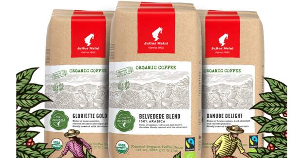 Это отразилось и на его иллюстрациях, в которых объем изображения (все они сделаны вручную) достигается за счет большого количества аккуратных прямых линий. Для Julius Meinl Стивен Ноубл изобразил двух работников, собирающих урожай кофе, чтобы потом отнести его в дом, стоящий на заднем плане на склоне горы. Первые эскизы оформления были представлены летом 2024 г. Как отмечается на сайте производителя, речь идет о трех новинках в линейке Originals (дополнения к ней, прошедшие сертификацию Bio Fairtrade): Belvedere Blend (в честь венского дворцового комплекса Бельведер), Danube Delight (букв. ― «Восхищение Дунаем») и Gloriette Gold (в честь барочного памятника из садов дворца Schönbrunn [Шенбрунн], основной летней резиденции Габсбургов). Описание наборов отсылает аудиторию к красоте и напыщенности императорской Вены и даже предлагает подумать о любимых завтраках династии Габсбургов. На всех трех продуктах ― одно и то же изображение. Линейка Originals стартовала в 2017 г., и на ее упаковках также был изображен работник рядом с кофейным деревом. По информации из открытых источников, это были первые кофейные продукты Julius Meinl, на которых присутствовало какое-либо оформление помимо абстрактных фигур или однотонных цветов, а также фирменного логотипа компании ― «Мавритенок» 1924 г. авторства Йозефа Биндера.Набор Vienna XVI blend из линейки Originals. Источник: сайт Julius Meinl