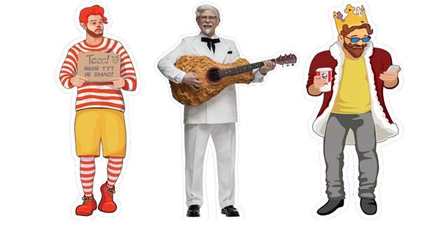 », «Разрешите представиться, полковник Сандерс», «Вкусно выглядит! Со мной делиться не надо», «Привет, расскажи, что нового!»В ближайшее время к Полковнику присоединятся маскоты конкурентов — клоун и король, сообщила компания. Увидеть картонную команду можно во флагманском ресторане KFC у метро Маяковская в Москве.