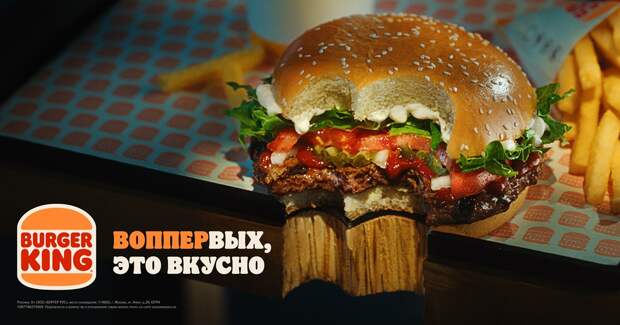Слоган кампании — «Воппервых, это вкусно». Акцент сделан именно на это блюдо в меню сети ресторанов быстрого питания. Кстати, героиня откусила не только стол, но и поднос, а также салфетку. «Этот укус сквозь стол — самый честный комплимент для нашего воппера. Ролик идеально передает дерзкий характер бренда: мы не боимся шутить и преувеличивать, чтобы говорить с аудиторией на одном языке», — отмечает руководитель отдела маркетинговых коммуникаций Бургер Кинг Диана Халилова. Сняло видео агентство Milestone by Starlink. Причем актер, который играет главную роль очень удивленного мужчины, в реальной жизни действительно делает деревянную мебель, добавляет исполнительный креативный директор Алексей Баохин.Клиент: Burger King Автор идеи — Андрей Грицинский Burger King: Коммерческий директор — Иван Шестов Директор по маркетингу — Юлия Соловьева Руководитель отдела маркетинговых коммуникаций — Диана Халилова Руководитель отдела медиа — Анастасия Барабанова Менеджер по маркетинговым коммуникациям — Анна Волкова Менеджер по маркетинговым коммуникациям — Ольга Буневская Продакшен: Chuck Studios Moscow Агентство: Milestone by Starlink CCO — Сергей Кряжев Executive Creative Director — Алексей Баохин Production Director — Максим Мосяков Head of Client Service Group — Арина Прокопович Account Manager — Диана Ганина Producers — Кристина Шамугия, Анастасия Родина, Мария Сукиасян
