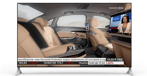 Новостной блок РБК закончился в салоне новой Audi A8. Видео с прямым эфиром телеканала переместилось на внутренние дисплеи автомобиля, встроенные в спинки кресел. Зрители досматривали выпуск глазами пассажира Audi.