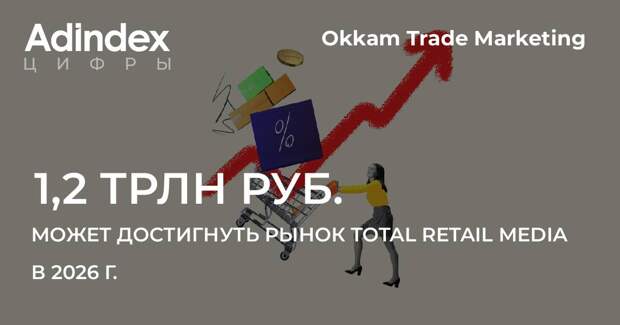 Доля Retail Media в общем объеме рекламного рынка России составит 46% в 2025 г. Общий прогнозируемый рост рынка Total Retail Media может составить 73% (с 515 до 891 млрд руб.), говорится в исследовании Okkam Trade Marketing. Сегмент может достигнуть уровня в 1,2 трлн руб. в 2026 г.
