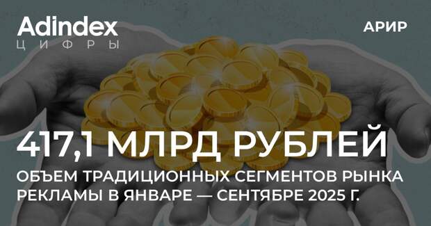 Объем традиционных сегментов рынка рекламы и продвижения в интернете составил 417,1 млрд руб. (без НДС) за январь ― сентябрь 2025 г. Это на 9% выше, чем в прошлом году, говорится в исследовании АРИР, представленном на Национальном Рекламном Форуме в Москве. Ассоциация посчитала доли в перформансе и брендинге.